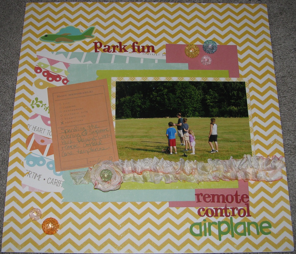 I used Echo Park Hello Summer patterned papers for my layout. I used a Smash journaling paper for my journaling. I used some Webster's Pages crystal embellies and cut the airplane using my Groovy Times Cricut cartridge. I used the limited edition "Summer Sprinkles" Crinkle ribbon for the pleating and the ribbon flower. Here's a close up view of the gorgeous ribbon~